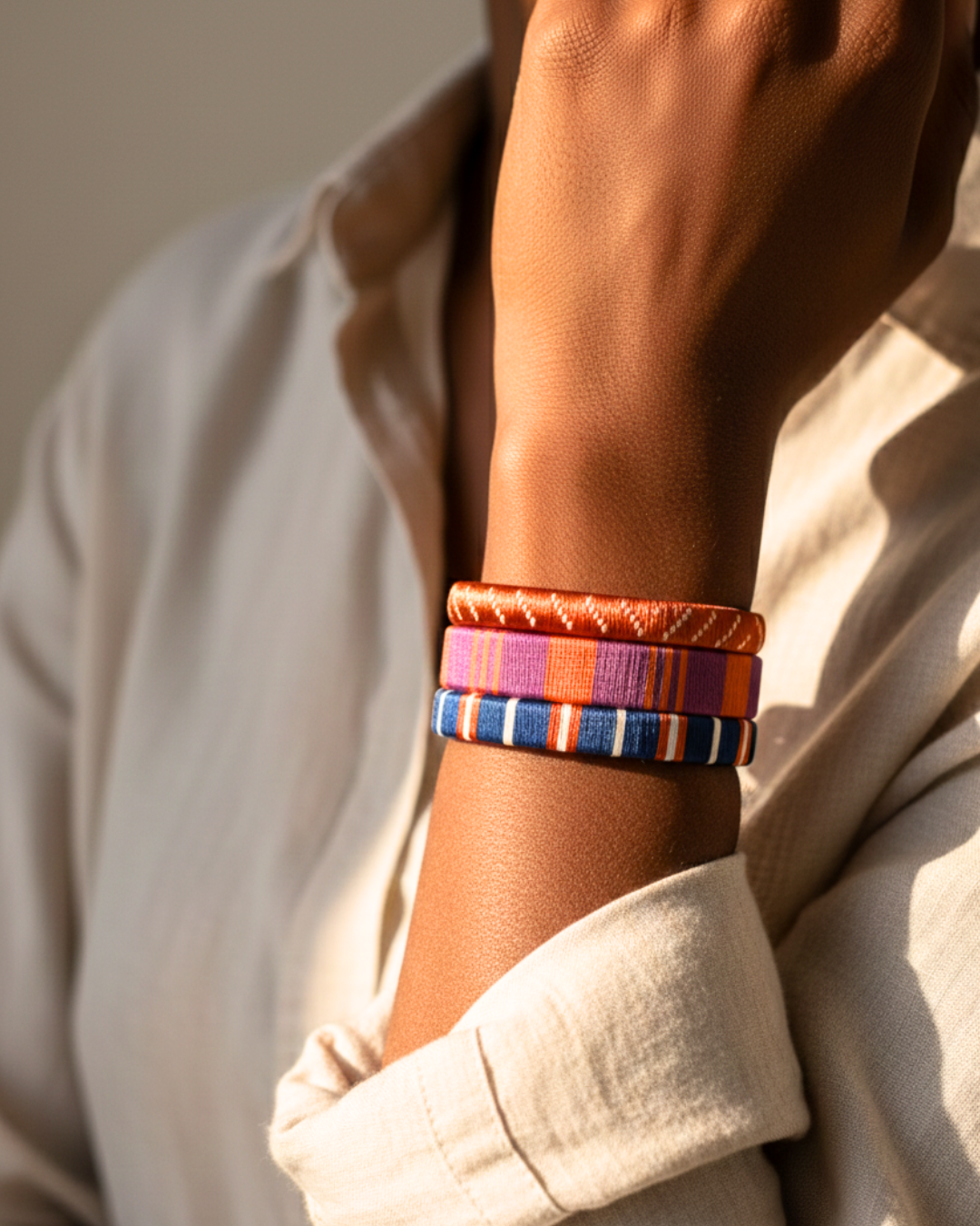 Los diseños combinan tradición ancestral con elementos contemporáneos, incorporando en algunas piezas metales como bronce con baño en oro de 24 quilates y cobre esmaltado, logrando piezas únicas de joyería y decoración.